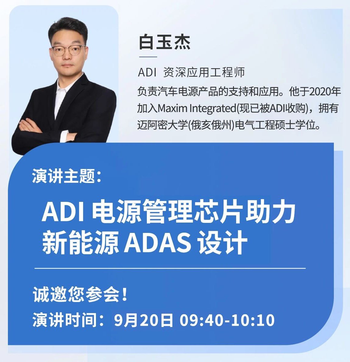 随着汽车电气化的发展,电源管理在系统设计中变得更加重要。ADI 在效率、BOM 优化和功率密度以及 ASIL 解决方案方面具有很强的优势。本次演讲将讨论 ADI 如何在电光管理芯片的性能、ASIL 解决方案和 BOM 优化助力新能源汽车 ADAS 设计。